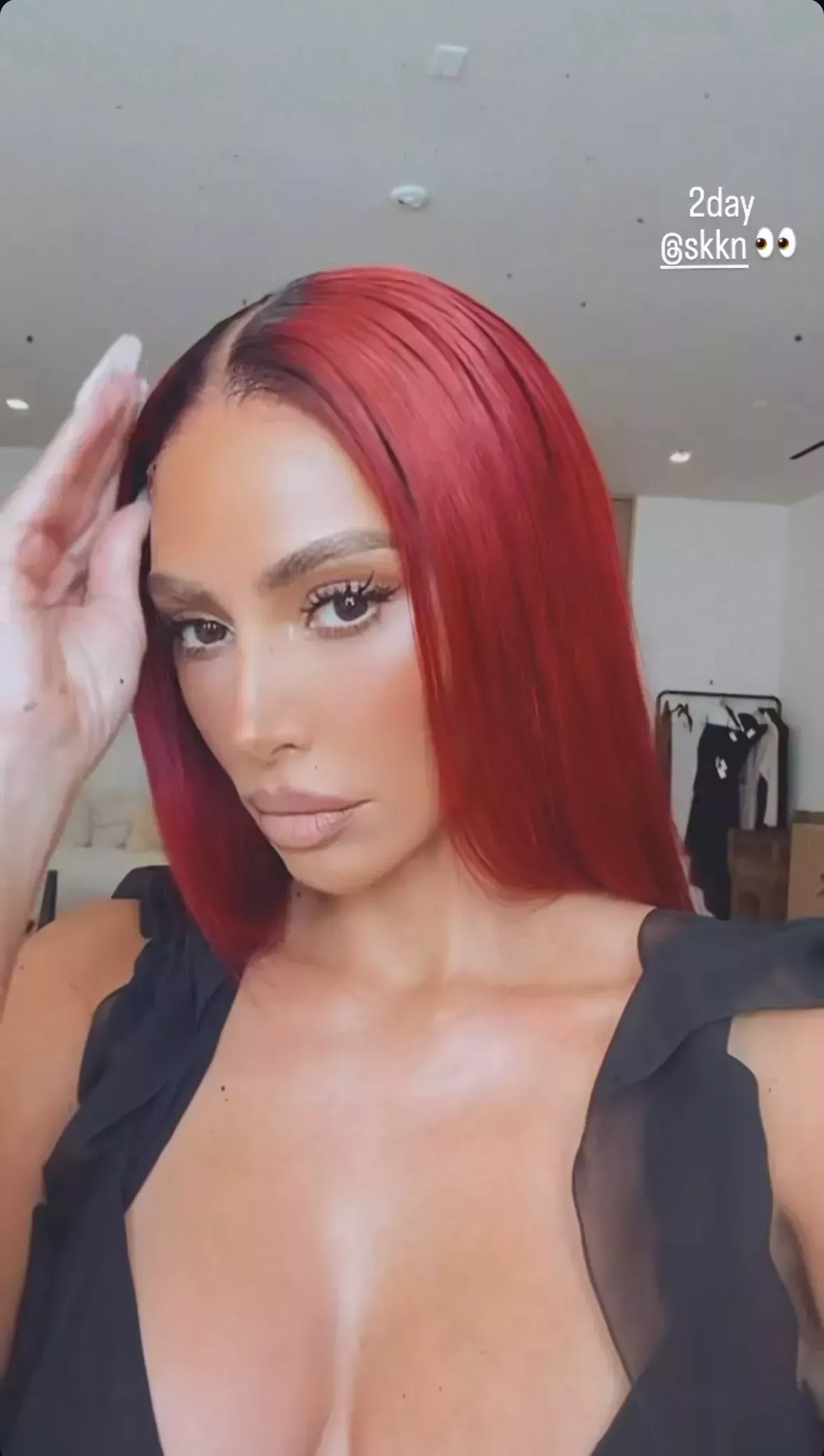 En el vídeo, Kim revuelve y alisa su pelo mientras lo admira en su cámara frontal. Y debe admirarlo. Tendría que llamar al color "terciopelo rojo"; de hecho, así es exactamente como lo llamamos hace seis años cuando fue tendencia como un gran color de pelo de otoño en 2018, y parece que podría estar haciendo un importante regreso después de esto. El profundo pero fresco tono de rojo se peina súper recto, con raya en medio y una prominente raíz en sombra.