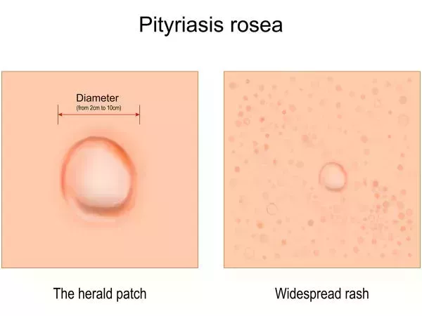 Después de que los síntomas de la gripe se resuelvan -generalmente en una o dos semanas- aparecerá una lesión cutánea de unos 10 centímetros de tamaño. Esta primera lesión se denomina mancha heráldica, dice Oberoi. La mancha heráldica aparece hasta en el 90% de los casos de pitiriasis rosada y suele tener una forma redonda u ovalada.
