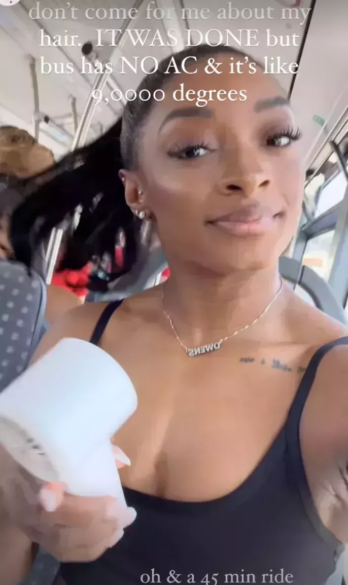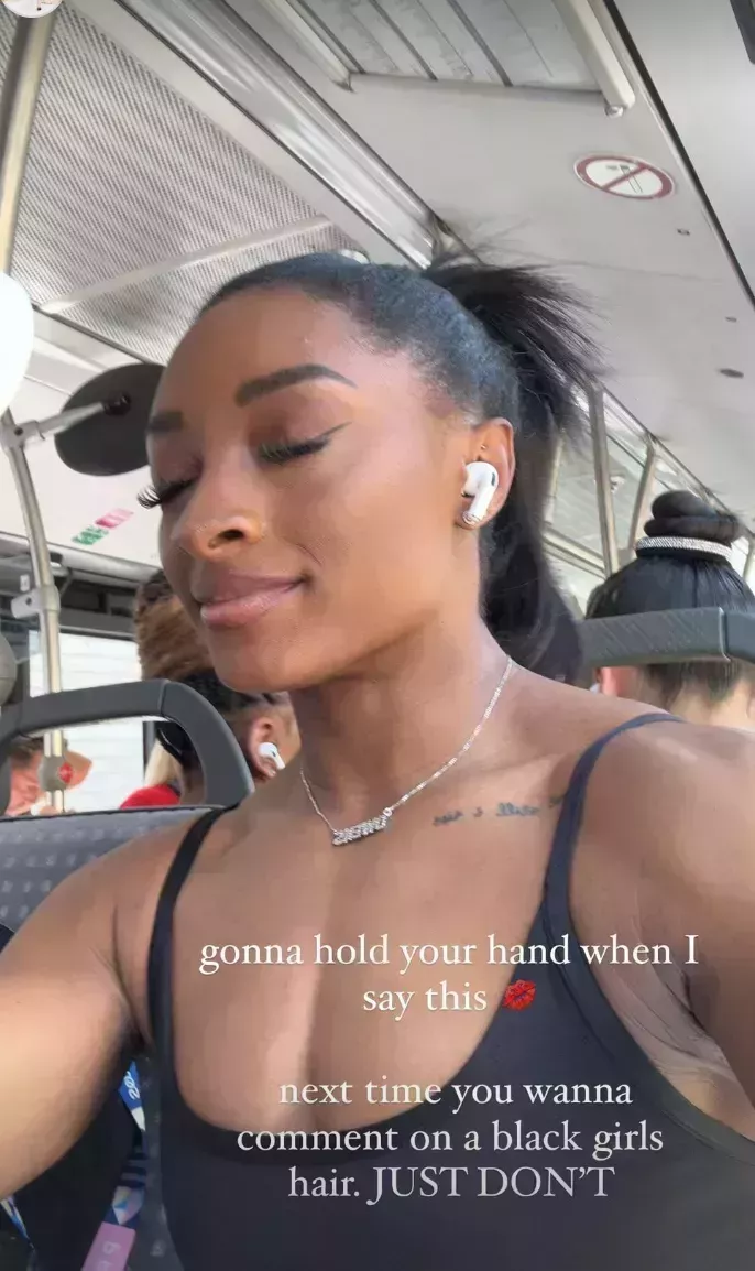 Hoy, Biles ha competido en la final por equipos de gimnasia de los Juegos Olímpicos de París 2024 y se ha llevado la medalla de oro en una victoria histórica que la convierte oficialmente en la gimnasta estadounidense con más medallas. Pero antes de eso, Biles tomó Instagram Stories para establecer algunos límites: "No vengáis a por mí por mi pelo. ESTABA HECHO pero el autobús no tiene aire acondicionado y hace como 9.000 grados", subtituló Biles un vídeo de Instagram Stories mientras sujetaba un ventilador eléctrico. "La próxima vez que quieras hacer un comentario sobre el pelo de una chica negra, simplemente NO LO HAGAS", subtituló un selfie.