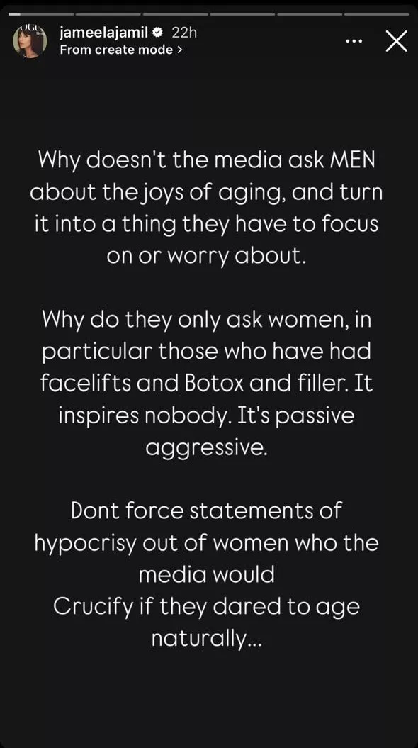 La historia de Instagram de Jameela Jamil decía: "¿Por qué los medios no le preguntan a los HOMBRES sobre las alegrías de envejecer, y lo convierten en algo en lo que tienen que enfocarse o preocuparse?"