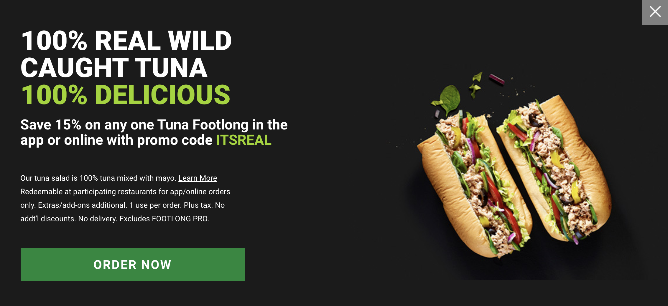 Cuando visitas la página web de Subway ahora mismo, aparece una oferta que te anima a pedir un bocadillo, promocionando que su pescado es "100% atún real capturado en la naturaleza, 100% delicioso". A continuación, comparten que se puede obtener un 15% de descuento en un sub de atún footlong pidiendo en la aplicación o en línea con un código promocional. Aunque la cadena no menciona explícitamente la demanda en el pop-up, el código promocional es "ITSREAL". En una declaración anterior a Delish, Subway calificó la demanda de "infundada".