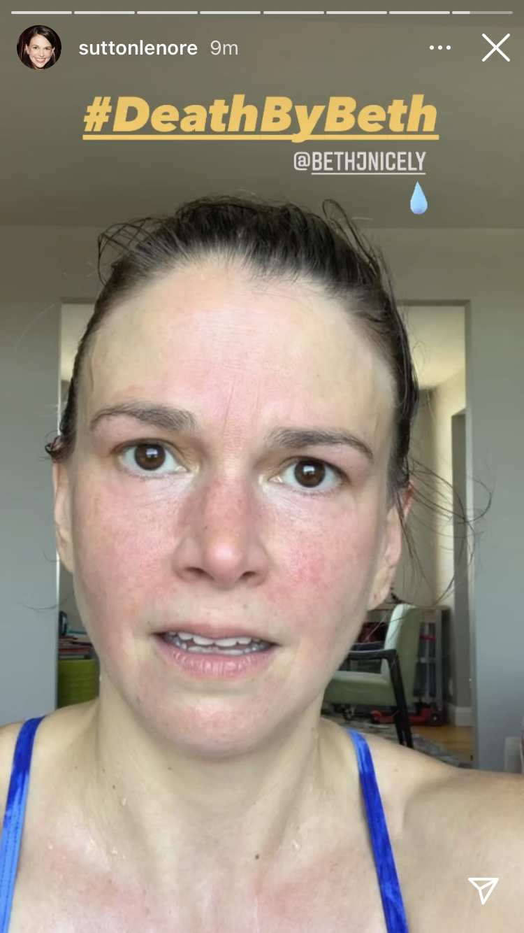 La ganadora de dos premios Tony, de 46 años, dejó caer una foto en su Instagram Stories en la que aparece sudando con el hashtag #DeathByBeth. Sutton también etiquetó a su entrenadora, Beth Nicely, intérprete de Broadway y fundadora de The Limit, que ofrece muchas clases de cardio y trampolín.