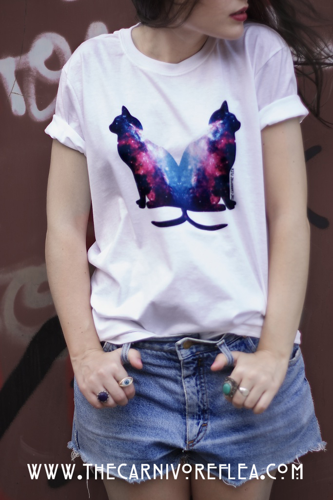 Nuestras camisetas favoritas son la camiseta de la silueta de los gatos con el fondo cósmico y la de los labios negros. Hemos muerto con esas dos. Y es que nos imaginamos llevándolas con un pantalón pitillo, o una falda mona, unos botines con tachuelas, y bien de collares, como ellos proponen desde su web, en la que podéis encontrar y comprar todas las camisetas.