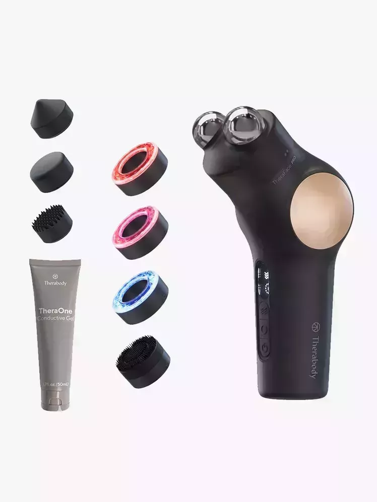 El dispositivo facial de microcorriente Theraface Pro de Theragun, ganador del premio Allure Best of Beauty y al que algunos usuarios de TikTok se han referido como un "Dyson Airwrap para la cara", viene con varios accesorios: microcorriente, percusión, limpieza, calor y frío y terapia de luz LED, cada uno con sus propios beneficios y objetivos de tratamiento.