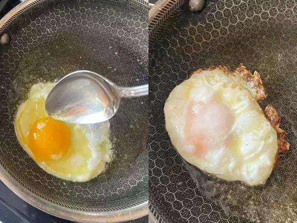 - Reducir el fuego a medio-bajo. Vierta una cucharada de aceite por encima y cocine durante dos o tres minutos hasta que los bordes exteriores estén crujientes y dorados y la yema esté cocida a la temperatura deseada.
