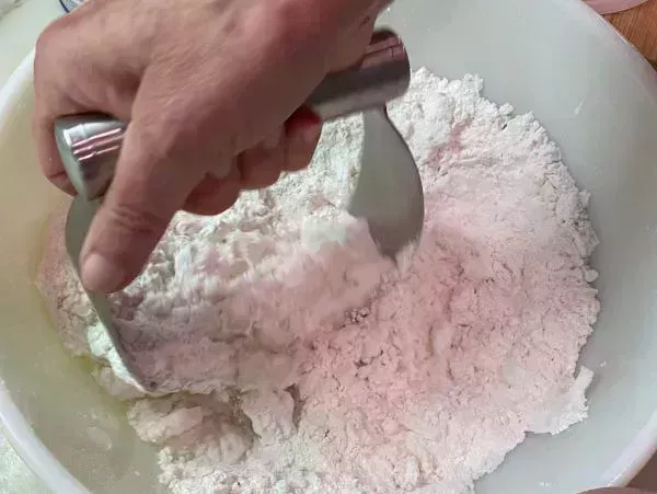 - Vierta el Crisco en el bol con la harina y, con un cortapastas, corte el Crisco en la harina hasta crear trozos de masa del tamaño de un guisante.