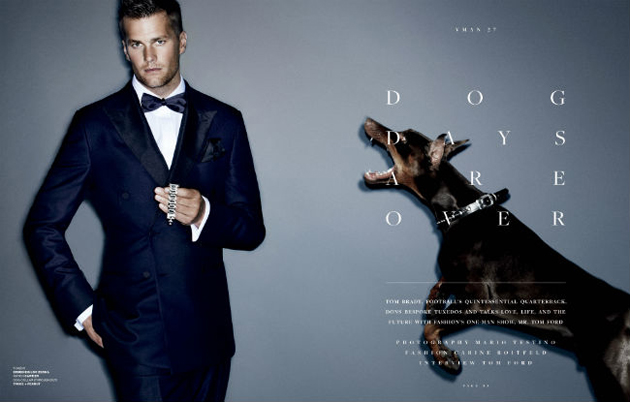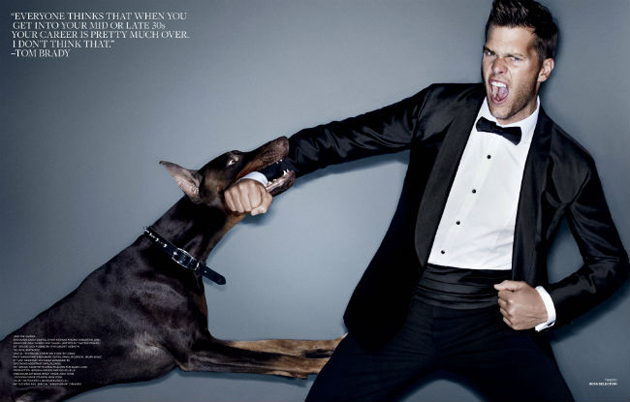 Lo vemos en una editorial muy agresiva, en la que Brady aparece con trajes de Givenchy, Tom Ford y Ermenegildo Zegna, mientras un doberman le ladra, le muerde el brazo o se avalanza sobre él.