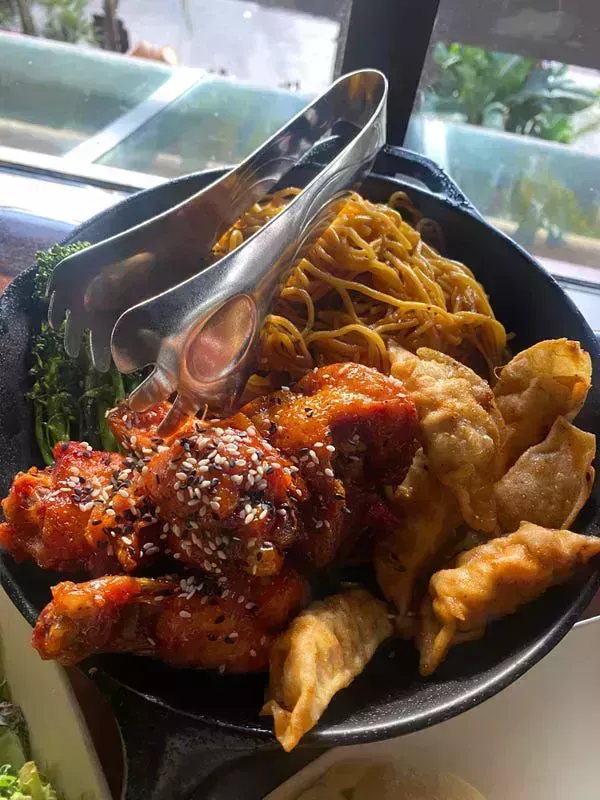 La cena consta de tres platos, empezando por un aperitivo de ensalada verde mixta y pan. El plato principal incluye alitas de pollo, albóndigas de cerdo y una sartén de fideos con carne y gambas. Y de postre, se puede disfrutar del famoso budín de pan a la moda del restaurante.