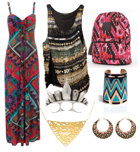 Desde Trenditty os proponemos algunas piezas de esta tendencia con las que podrías hacer tu peculiar guiño a la tribu. Para empezar, lleva todos tus enseres en esta mochila Volcom One Way Ticket, que es perfecta si te mueves en bicicleta por la ciudad. El anillo doble es de la talentosa Pamela Love. Los pendientes son de la colección que Nicole Richie ha hecho con House of Harlow y de esta marca también es el brazalete. La gargantilla de oro es de Motherboard Matinee. Las prendas son de Balmain, el top, y el maxi vestido de Wallis.