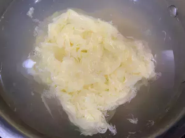 Entonces, es el momento de hacer un remolino. Revuelvo el agua en el sentido de las agujas del reloj hasta que se arremolina. Mientras el agua sigue dando vueltas en la olla, vierto los huevos batidos y coloco una tapa sobre ellos.