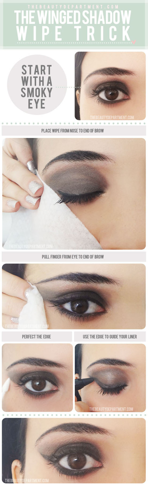 Un buen truco para lograrlo es, una vez que ya hayamos dibujado el ojo con sombras, y antes de que nos hayamos puesto la base, cogemos una toalita tipo desmaquillante y hacemos lo que proponen las chicas de The Beauty Department: poner uno de los lados de la toallita en un ángulo que vaya desde el final de la ceja a la nariz, esto te garantiza que se borrará aquello que queda fuera y que el resto del maquillaje quedará perfectamente definido. Después para rematar el ojo, no te olvides de dibujar la línea del ojo. Te será mucho más fácil pues habrás conseguido crear una especie de guía.