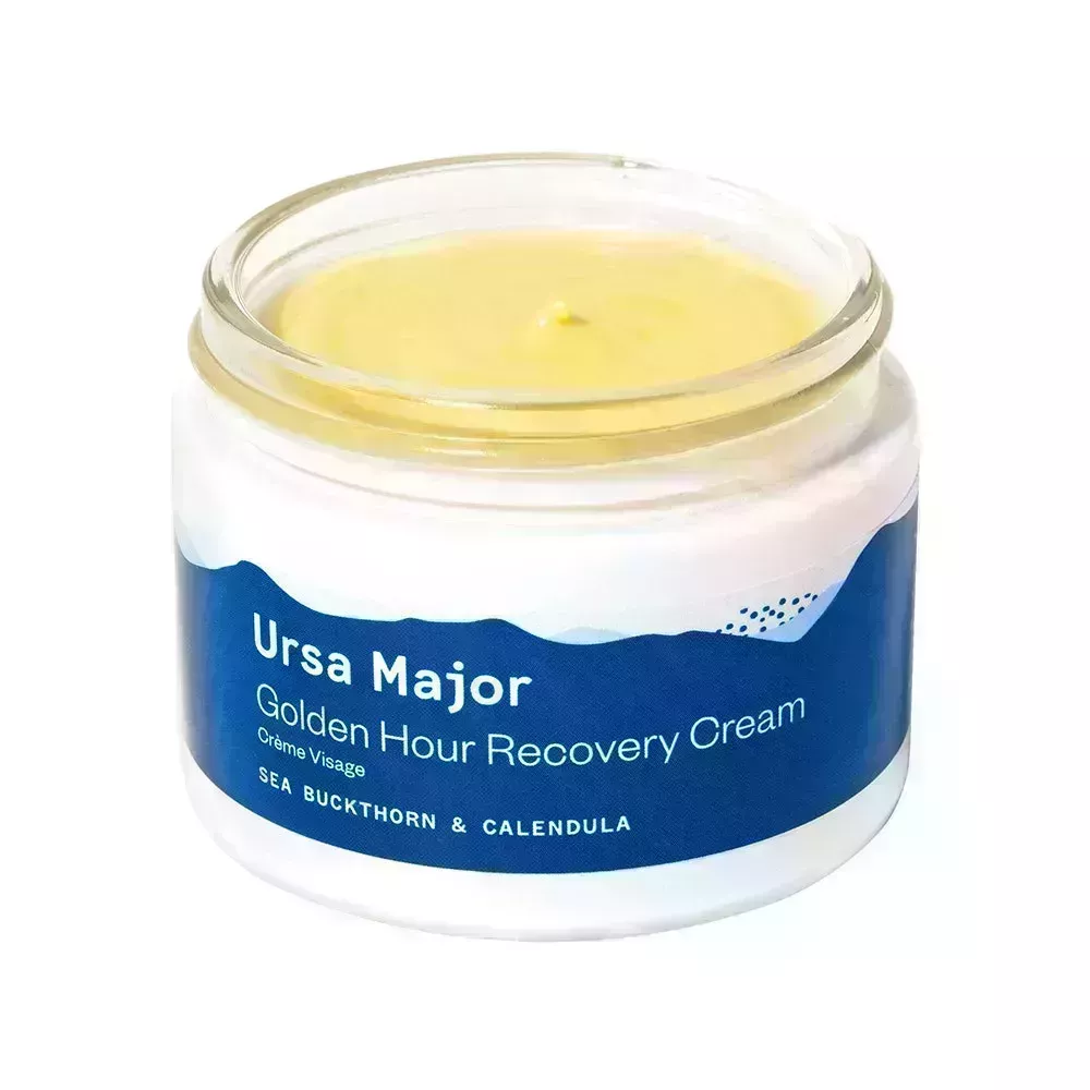 La crema Golden Hour Recovery de Ursa Major no sólo parece un tarro de sol, sino que también es un batido de superalimentos para tu cutis. El espino amarillo refuerza la barrera de hidratación de la piel, mientras que la grosella negra mejora la firmeza y la elasticidad y la caléndula calma y acondiciona la piel. Es el último paso ideal de tu rutina de cuidado de la piel para sellar todas las bondades.