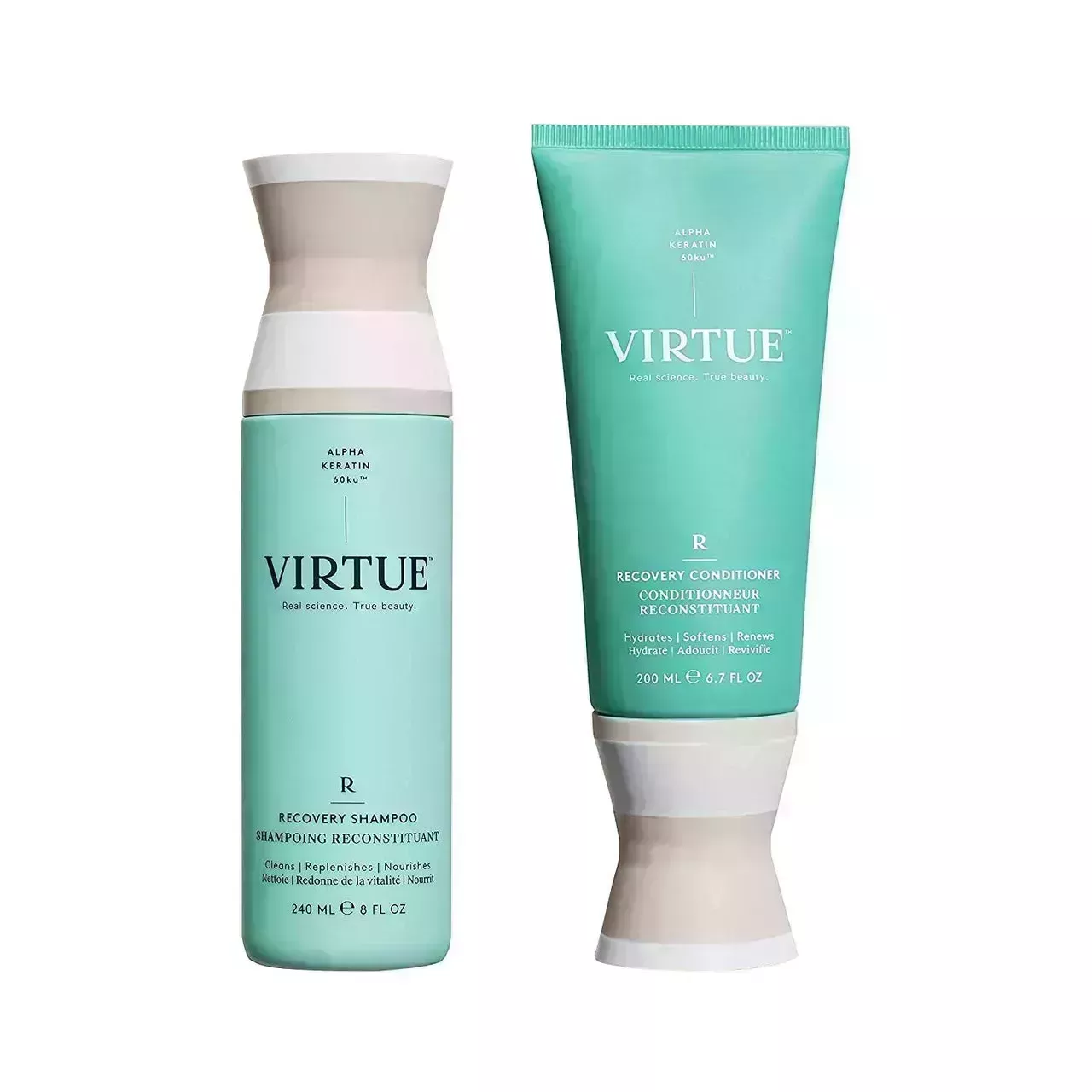 El set de champú y acondicionador Recovery deVirtue está pensado para el cabello seco y dañado. Este dúo para el cuidado del cabello con aroma a coco y yuzu deposita queratina en las grietas de las cutículas y repara los daños causados por el calor, los productos químicos y los tratamientos de coloración.