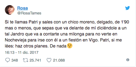 Los usuarios de Twitter se unen para buscar a Patri, una chica a la que su novio pretende engañar en Nochevieja.