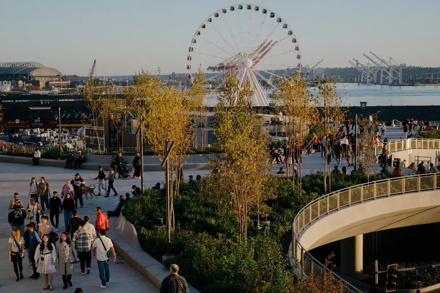 Los visitantes y locales ya abarrotan un nuevo paseo que abraza la costa comercial del centro de Seattle, donde muelles de madera alternan con vistas a Elliott Bay.
