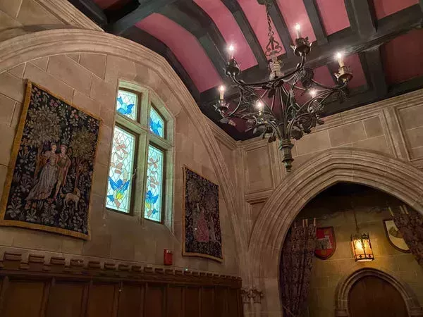Entramos por el vestíbulo del castillo, que está adornado con una decoración de aspecto medieval que incluye una armadura, tapices, escudos y espadas.