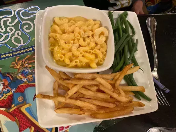 Lo mejor de los platos para niños es que vienen con dos guarniciones a elegir, como maíz con mantequilla, puré de patatas, patatas fritas, judías verdes o arroz pilaf.