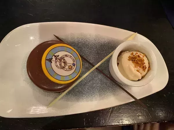 El postre Clock Strikes Twelve, una mousse de chocolate negro con un centro de caramelo y praliné crujiente servido con gelato de avellana, fue mi favorito. La presentación, adornada con un reloj que marca las 12, es un detalle divertido.
