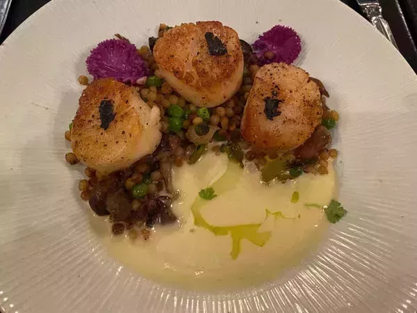 Mi amigo pidió las vieiras a la sartén y dijo que eran sabrosas y llenadoras. Estaban acompañadas de pasta con cebollas salteadas, champiñones, ajo y una salsa de crema de parmesano.