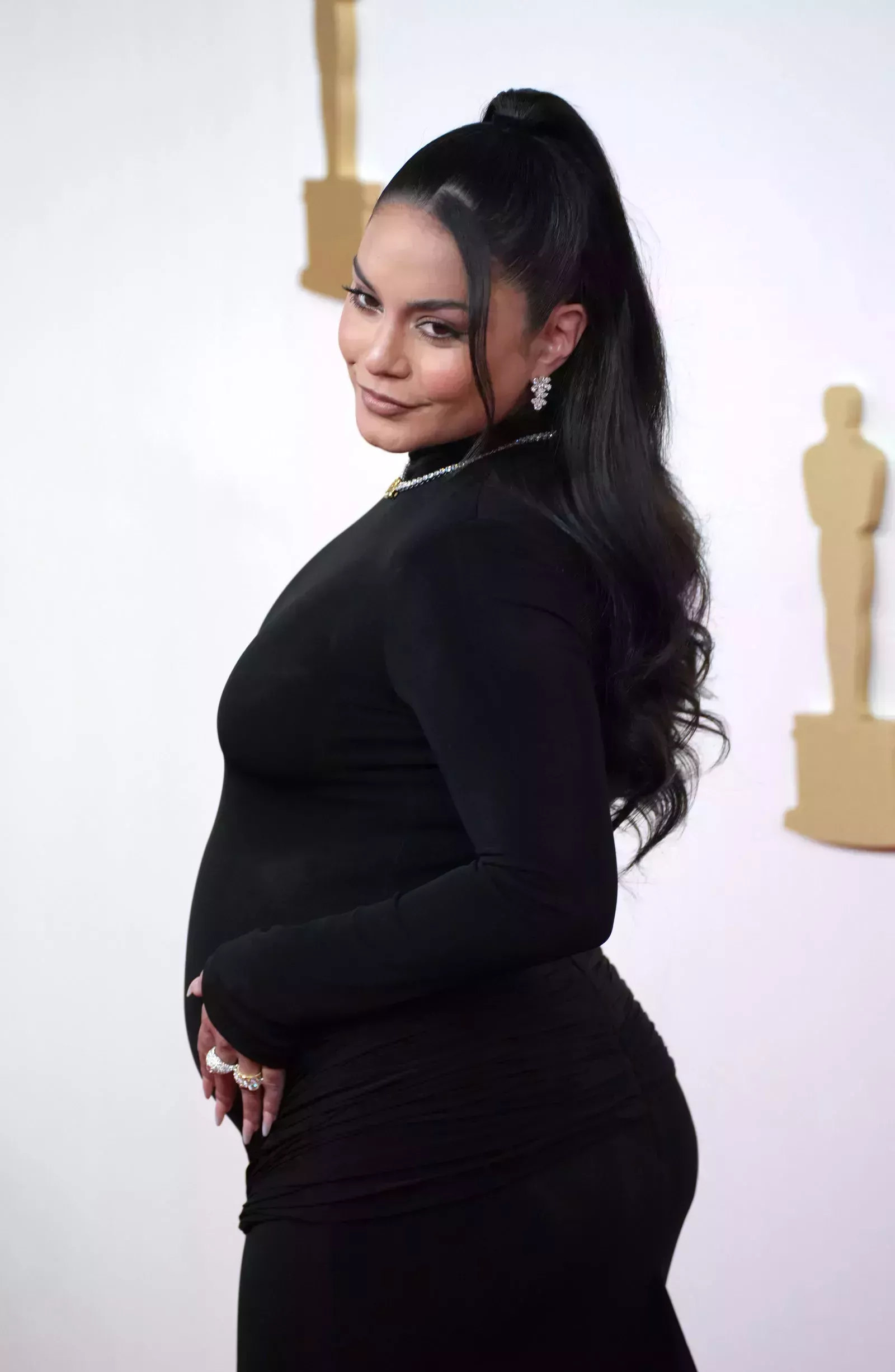 Hudgens, que se casó con el jugador de béisbol Cole Tucker en diciembre, había ocultado con éxito su nueva y hermosa silueta hasta ahora, llegando a los Premios de la Academia con un vestido negro de cuello alto de Vera Wang, que también diseñó su vestido de novia. Y a juego con su vestido estaba su pelo largo y oscuro - y cuando digo largo, me refiero a que hay literalmente dos pies de extensiones allí.