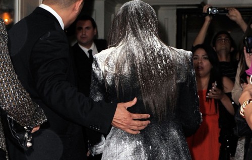 En la foto a la que veis unharinada perdida es a Kim Kardashian. La socialité se encontraba posando en un Photocall cuando alguien de PETA le arrojó una bomba de harina por usar abrigos hechos con pieles.