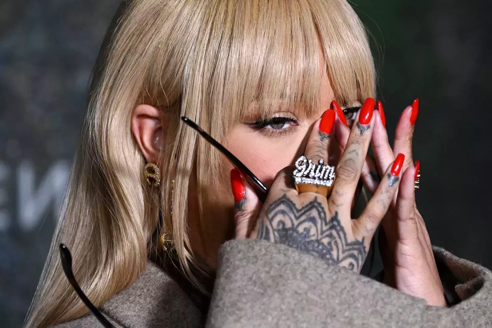 El flequillo rubio no fue el único momento glamuroso. Rihanna volvió a la combinación de labios y uñas rojo sobre rojo que lució durante su actuación en el Halftime Show de la Super Bowl, con unos labios carmesí brillantes de Fenty Beauty, obra de la maquilladora Priscilla Ono, y una manicura escarlata cuadrada a juego, obra de la manicurista Jenny Longworth. Bajo el flequillo, Ono aplicó una sombra brillante color champán sobre los párpados de la músico y luego definió sus ojos verdes con un sutil delineado negro.
