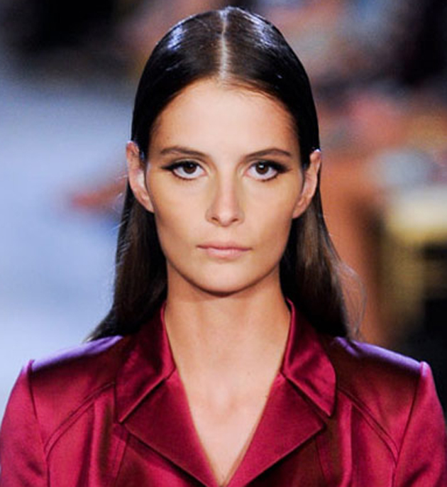 ¿Qué peinado y maquillaje propone? Cabello suelto, con raya en medio, parte de arriba muy pulida y algo pegada a la cabeza, y el resto de la melena cae con ligereza sobre los hombros y la espalda. En el maquillaje se potencia la mirada de las modelos, que se estiliza con pestañas postizas, eyeliner arriba y abajo del ojo, y abundante máscara de pestañas.